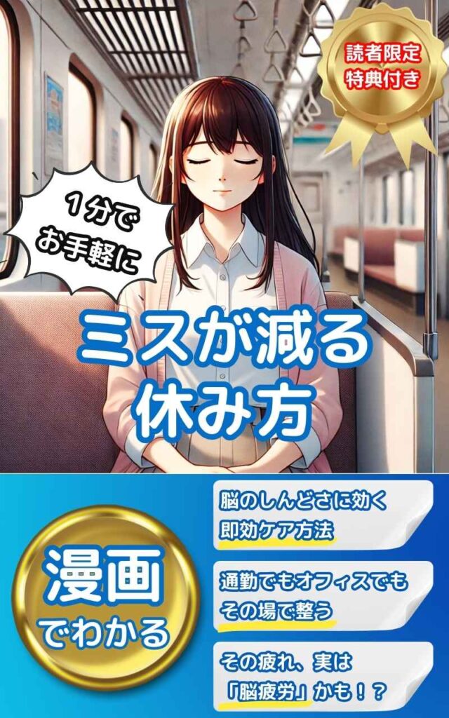 脳疲労・自律神経の乱れ・集中力低下対策として、通勤中や就寝前に「1分・3分・10分」でできる休み方を、漫画を交えながら解説しました。ミスを減らし、睡眠と仕事の質を上げる実践ガイドになっています。